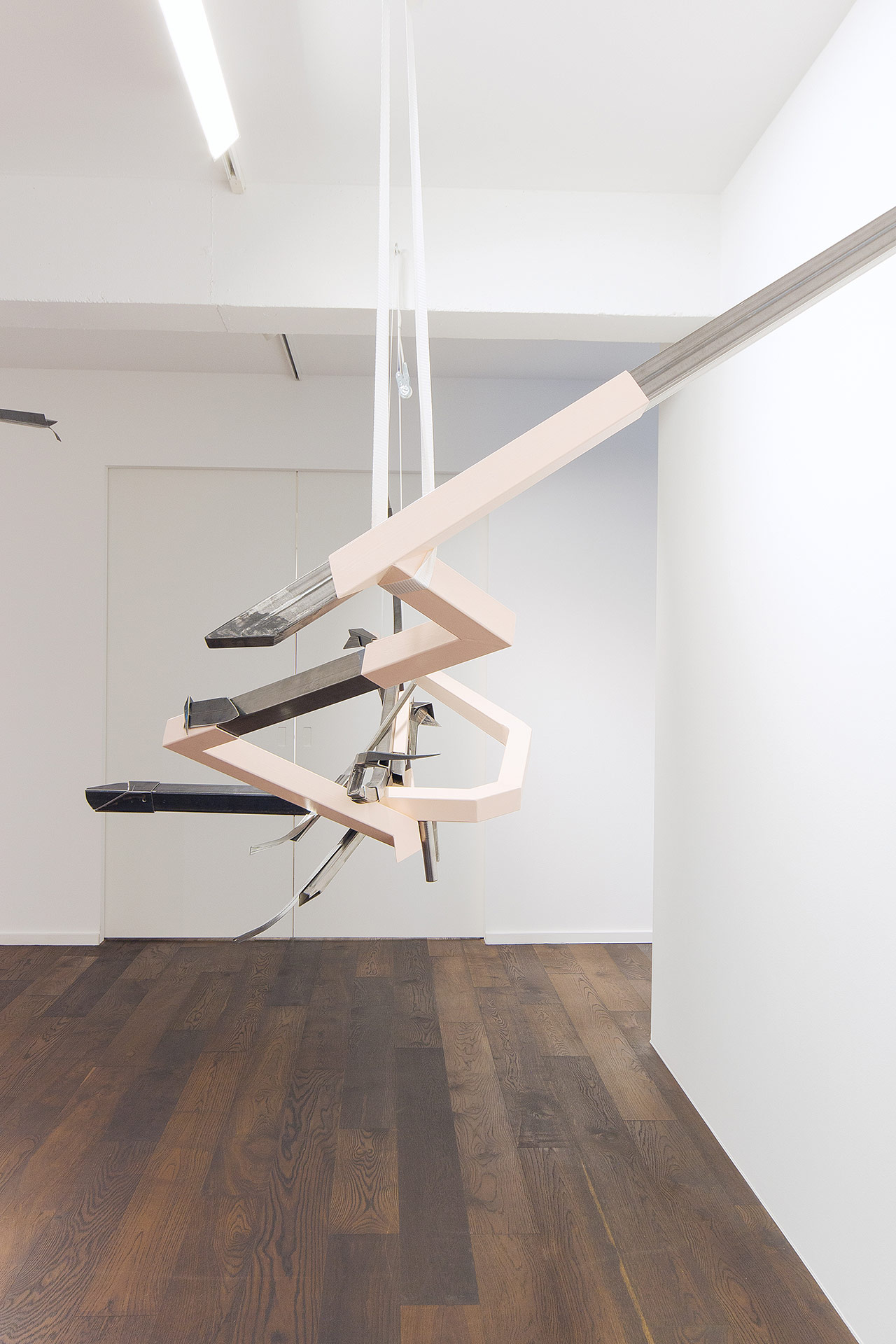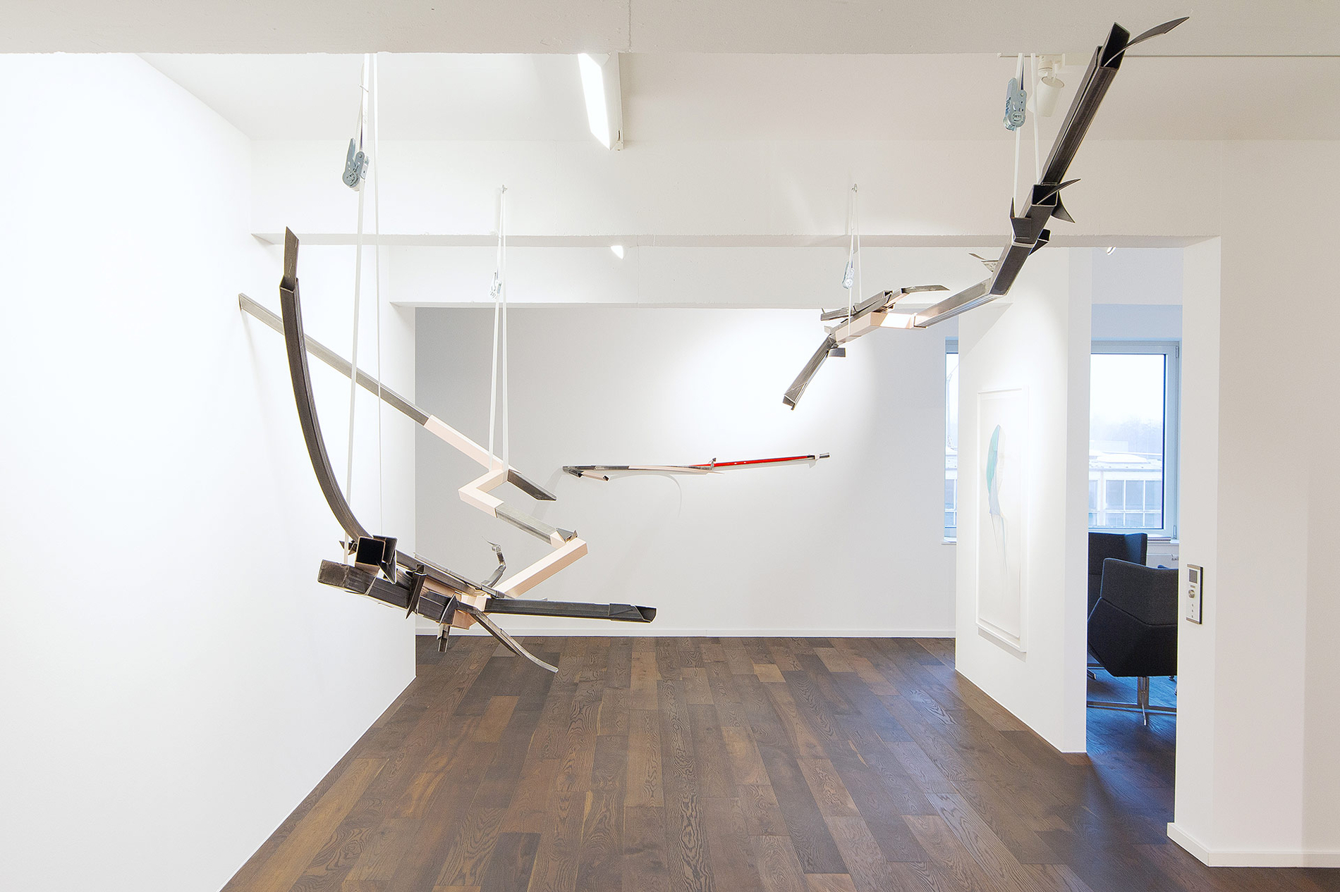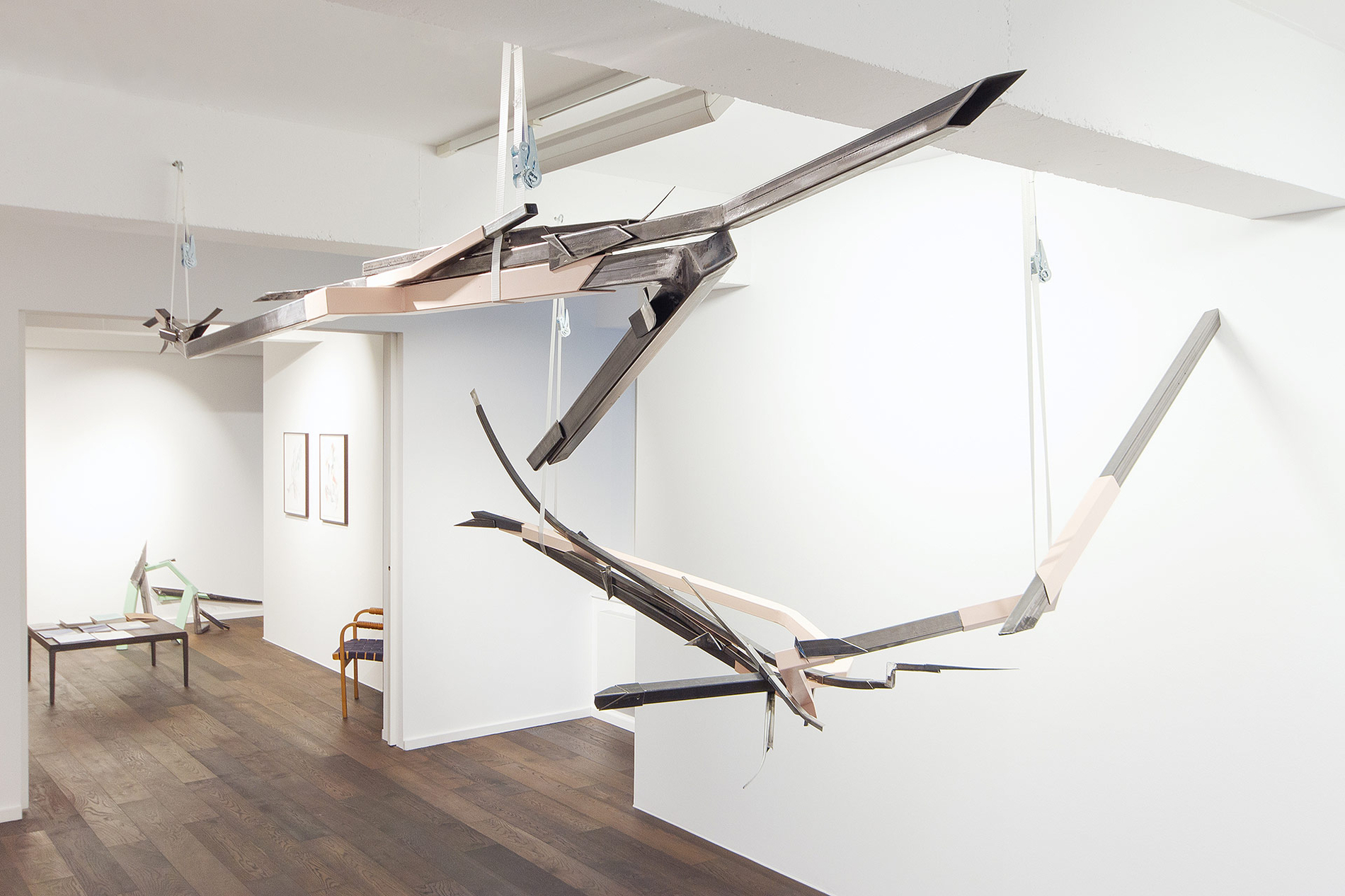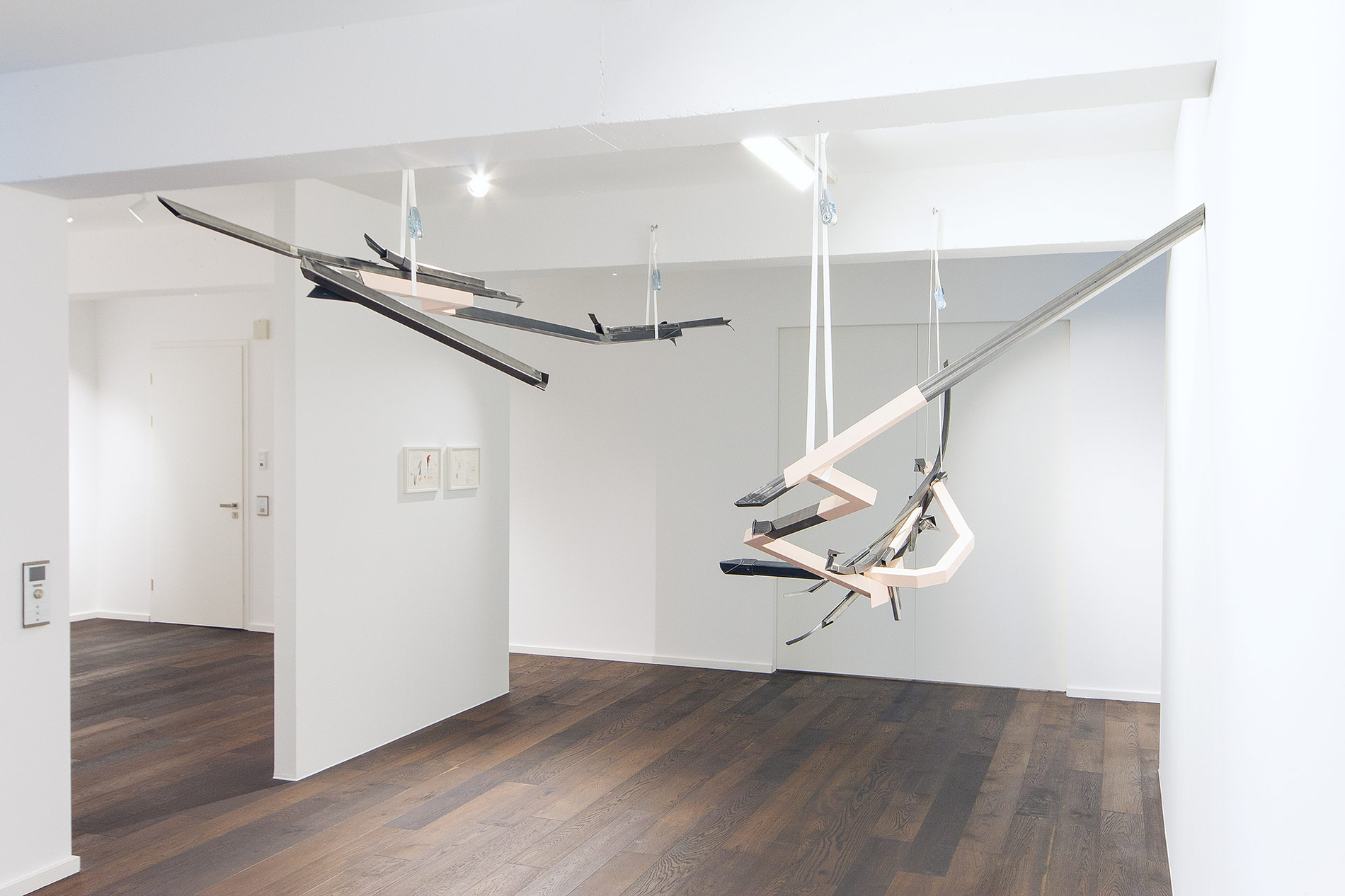 Diese Erfahrung wird in Justyna Janetzeks neuer Werkreihe On the Verge of Letting Go unmittelbar erfahrbar: ein poetisch-mystischer Zustand zwischen Kontrolle und Hingabe, Struktur und Intuition, der in der Site-Specific-Installation, eigens für die räumlichen Gegebenheiten der Sammlung Peters-Messer konzipiert, sinnlich erlebbar wird. Sich entfaltende und gehaltene Decken-Skulpturen, filigran balancierende Wandarbeiten und modulare Stahlobjekte reagieren auf Architektur, Lichtführung und Raumdimension und schaffen ein sensibles Gleichgewicht aus Kraft und Leichtigkeit, Präsenz und Schwebe.